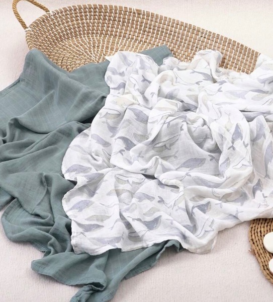 2-Piece Muslin Baby Receiving Blanket Set – Olive Green & Blue Whale Print